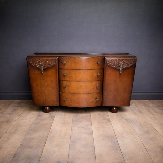 Vintage Art Deco Walnut Sideboard | Bow Front Cabinet with Drawers & Cupboards