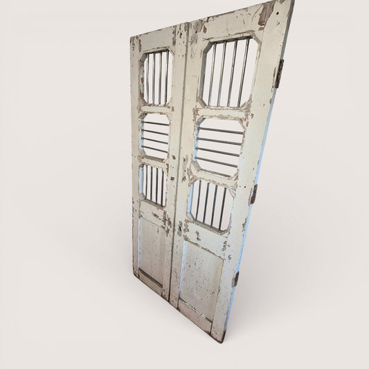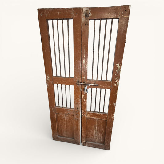 Antique Indian Jali Doors – Pair of Rustic Wooden Panel Doors with Iron Bars | 182cm x 91.5cm Total