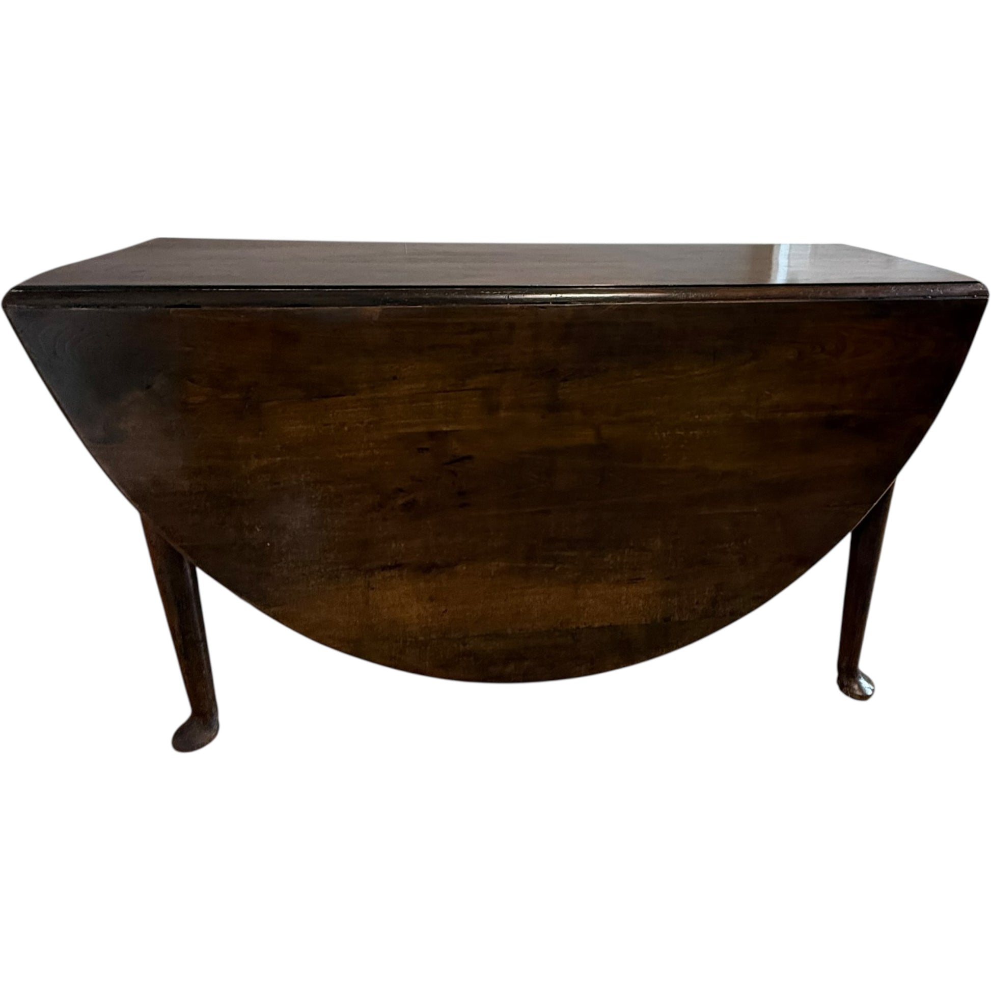 A large antique Georgian mahogany wake table with an elegant oval drop leaf design.