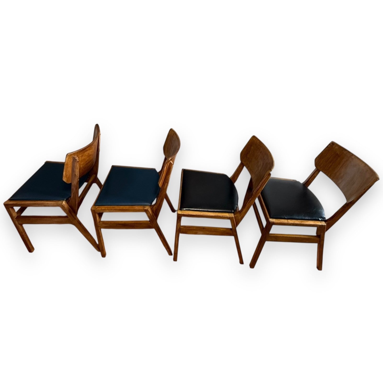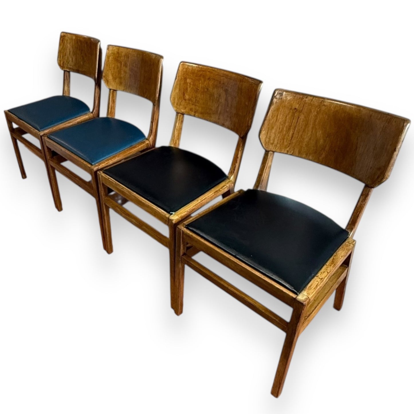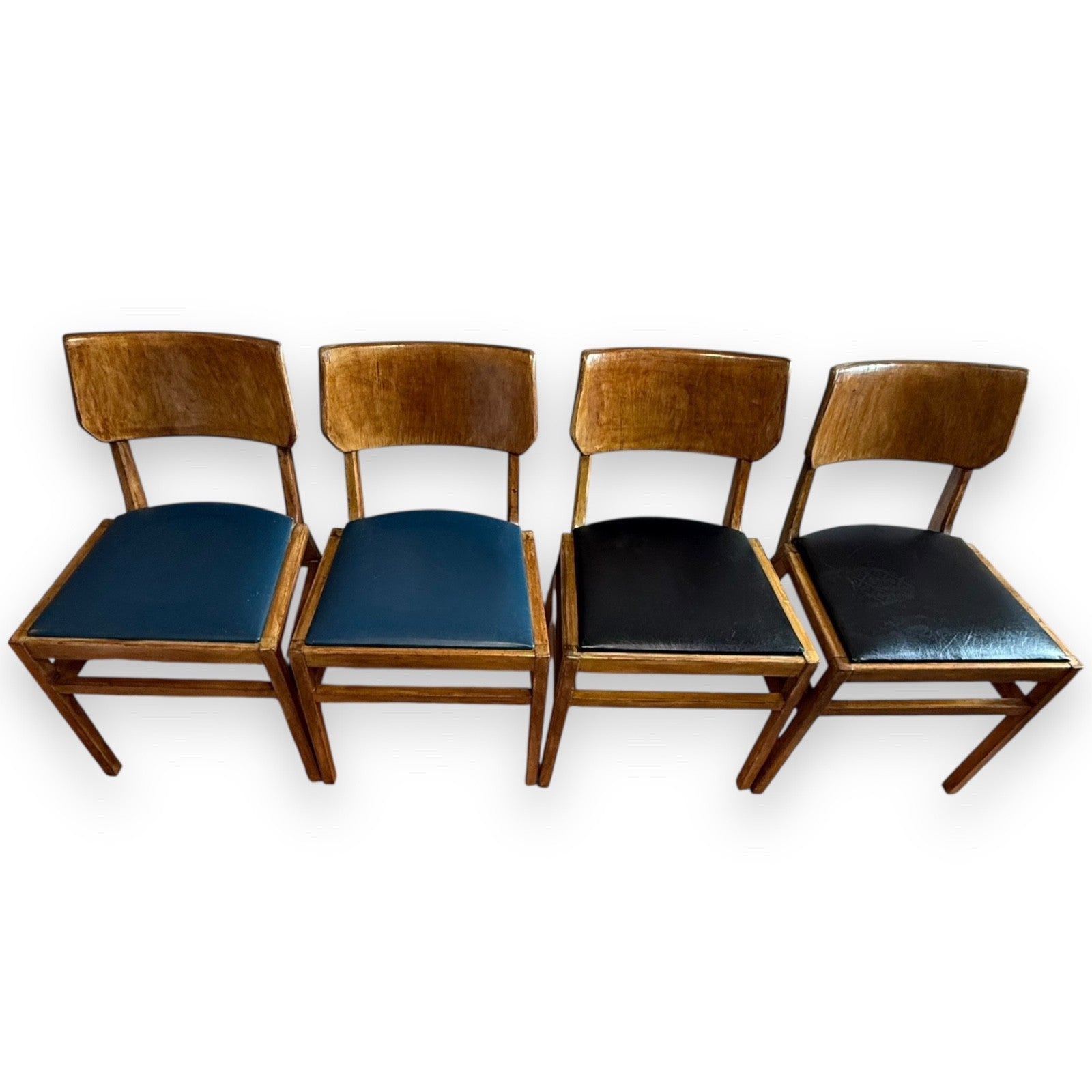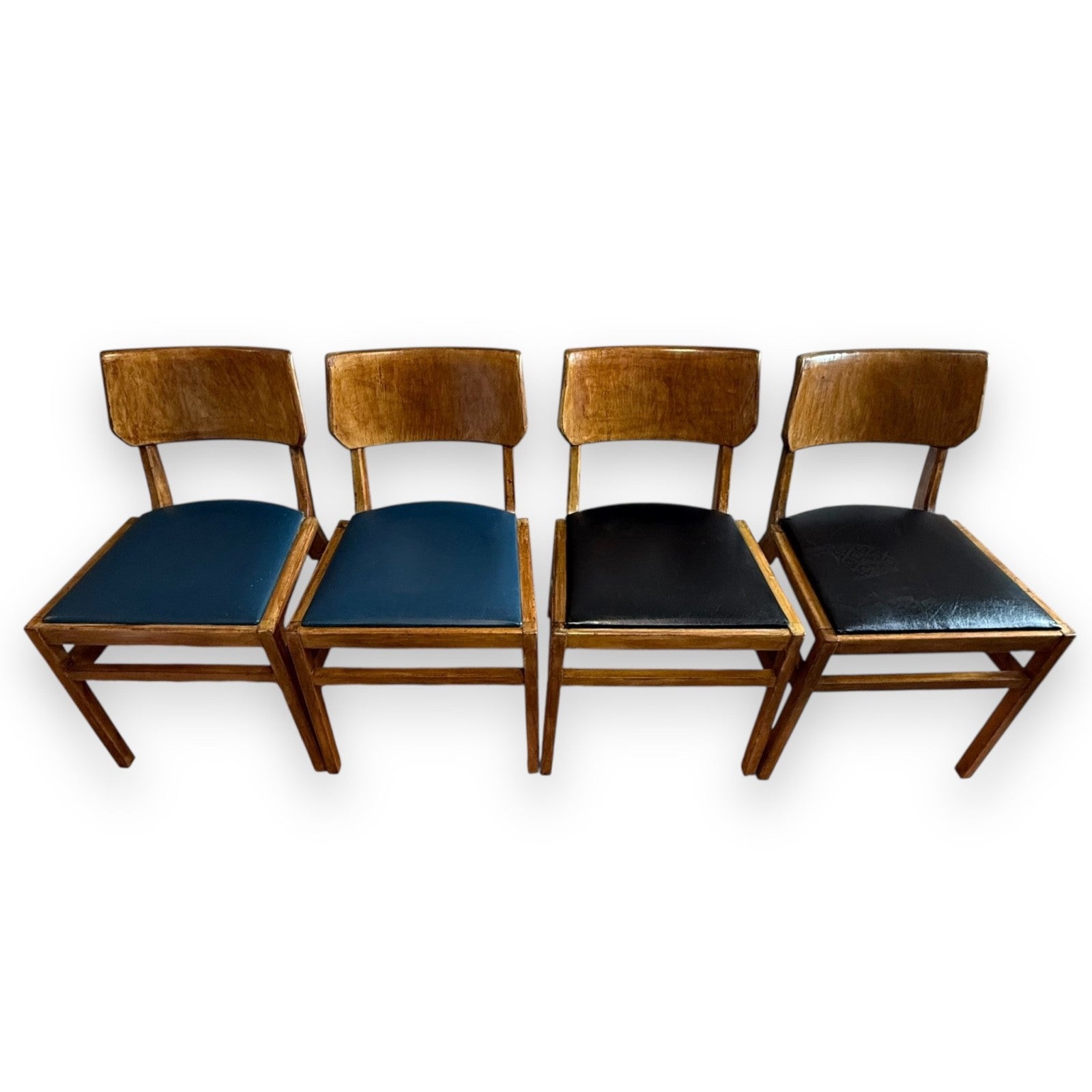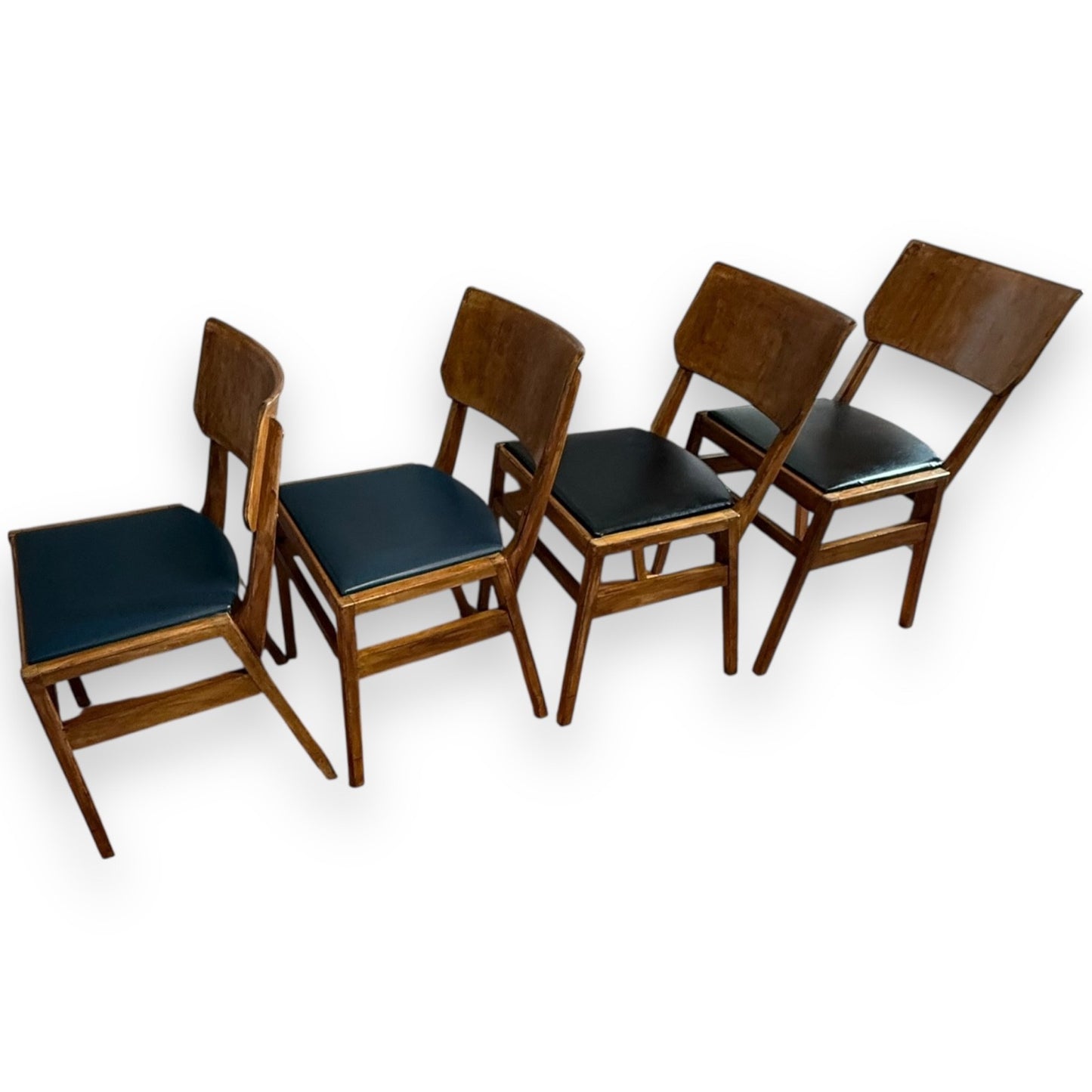 A stylish set of four mid-century dining chairs with a classic café-style design. Each chair features a solid wooden frame with angled legs, gently curved backrests, and upholstered seats in black and navy vinyl for a practical retro look.