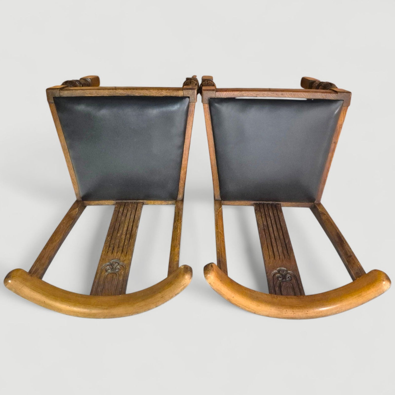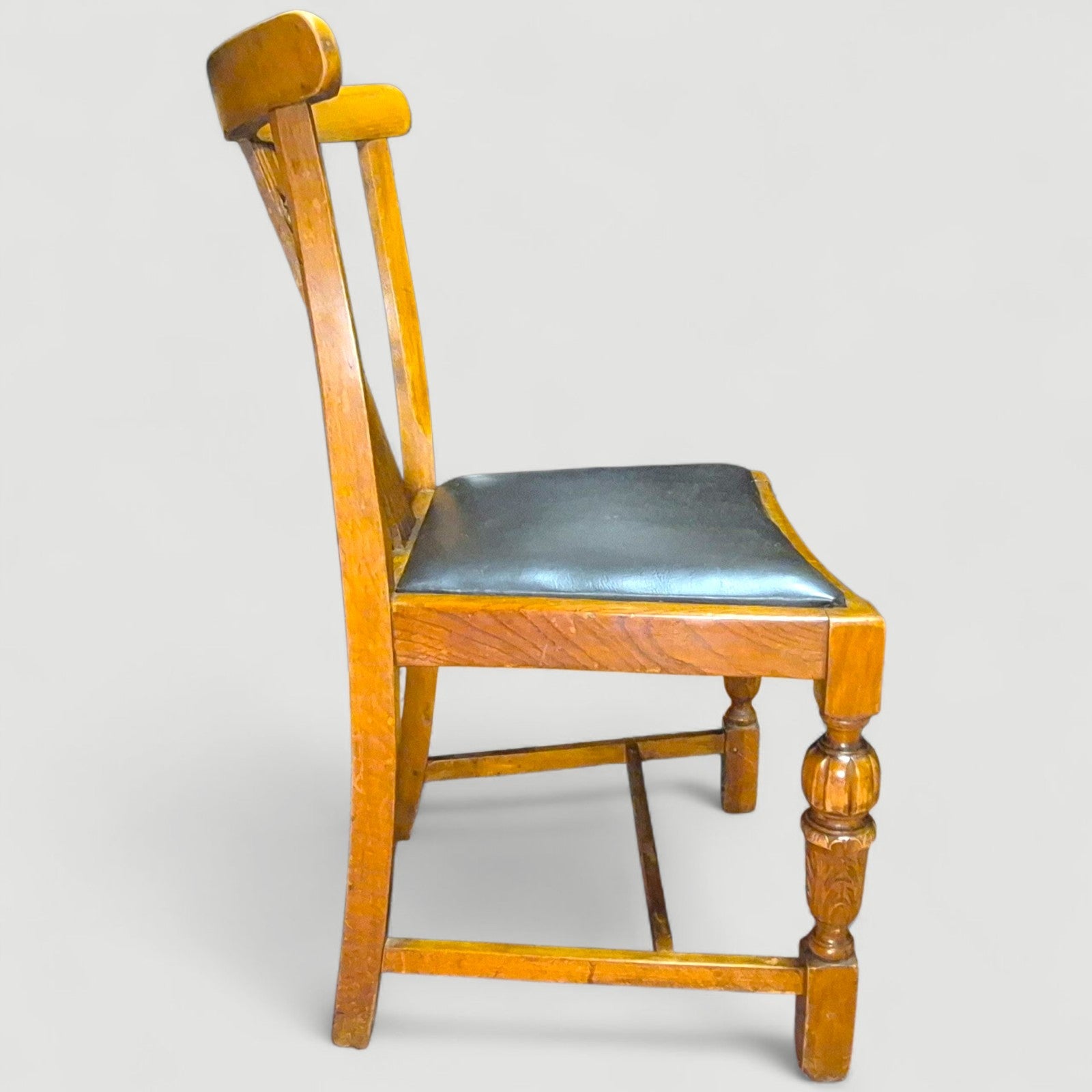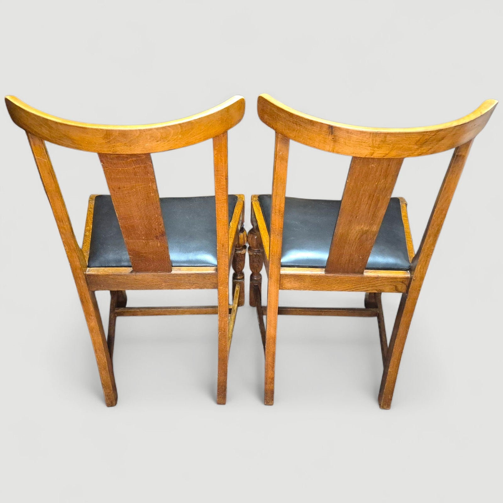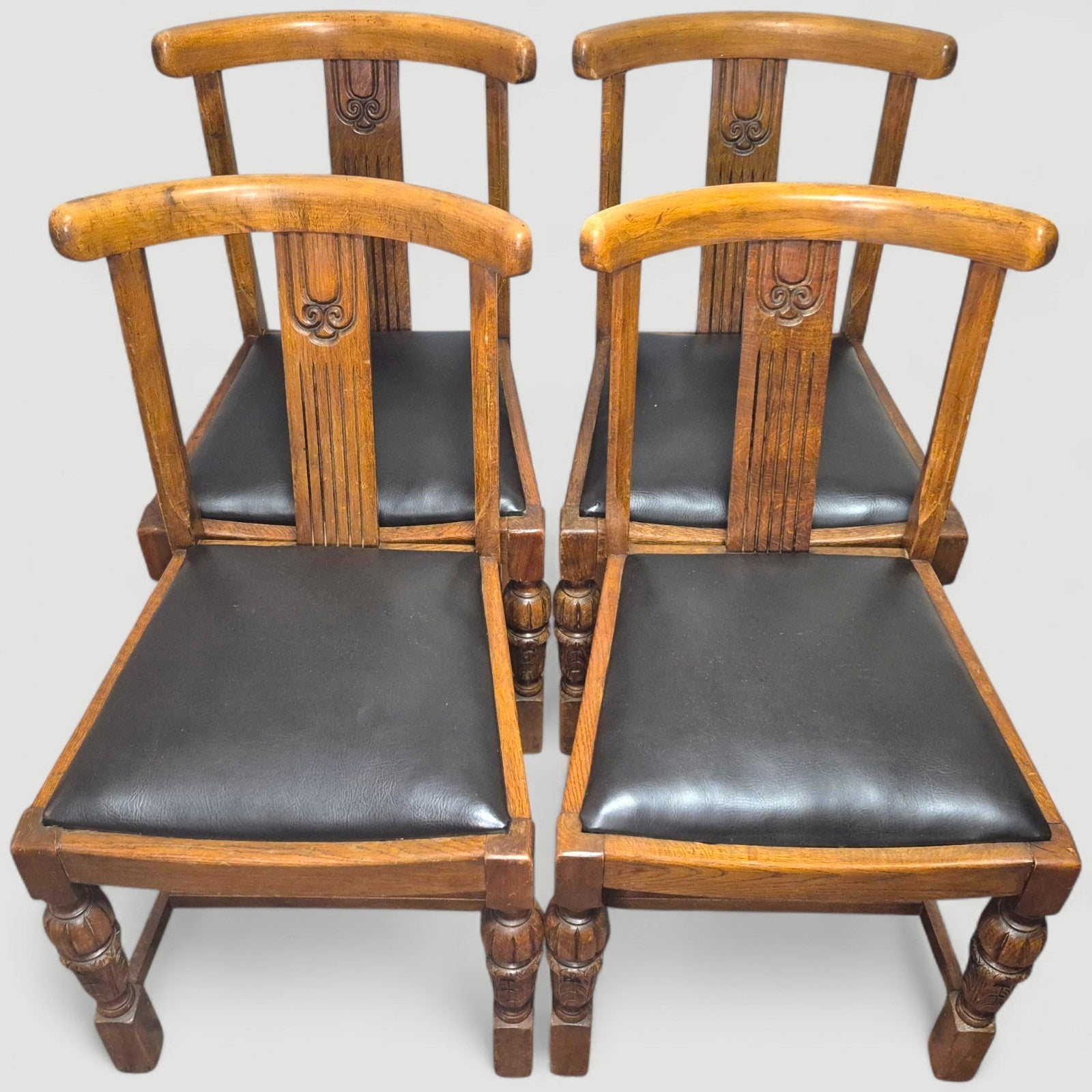 Set of 4 Vintage 1920s Honey Oak Dining Chairs – Carved Detail & Black Upholstered Seats