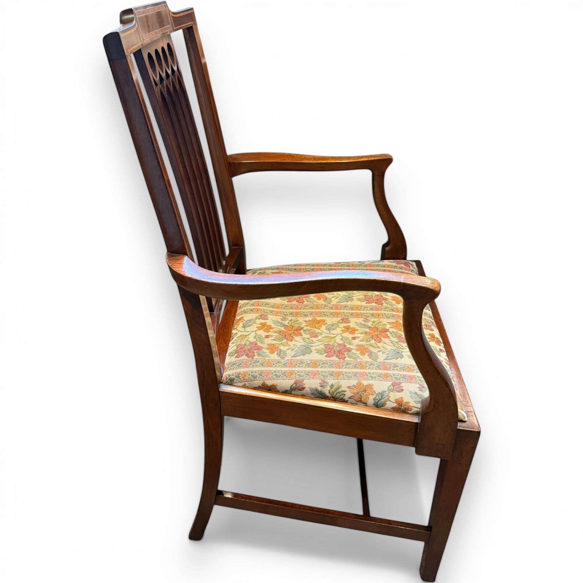 The chairs feature elegant pierced Gothic splat backs with decorative inlaid detail to the top rails. The frames are raised on square tapering legs united by stretchers, typical of Edwardian dining chair design.